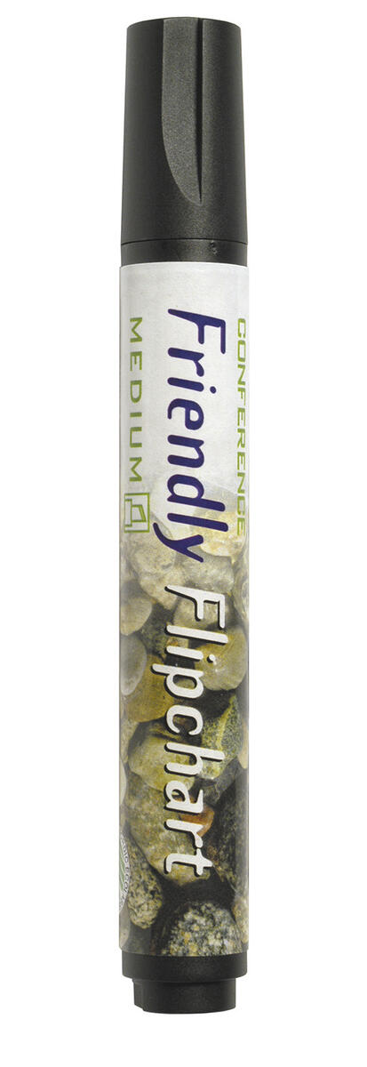 Blädderblockspenna Friendly Flipchart. Vattenbaserat tvättbart bläck som ej blöder igenom blädderblocket. Pennkopp av returpapper, 2-5 mm snedskuren spets. Skrivlängd ca 550 meter.