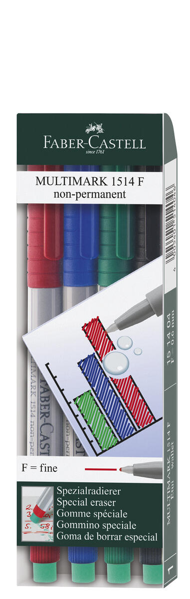 4 st/fp. Faber-Castell Multimark vattenlöslig märkpenna Fine 0,7 mm. Hög färgstyrka, god ljushärdighet. Skriver på de flesta material. Unik radertopp för glatta ytor. Pennkropp av plast. Innehåller röd, grön, blå, svart. PVC-fri.