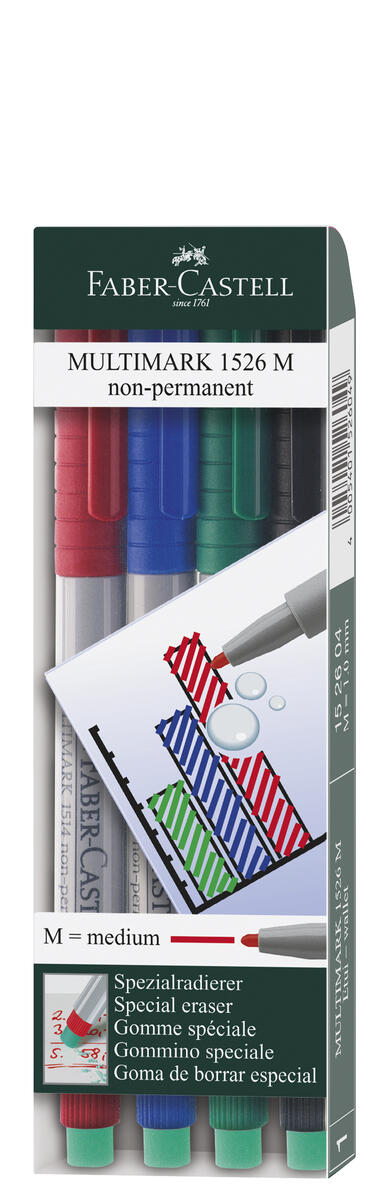 4 st/fp. Faber-Castell Multimark vattenlöslig märkpenna Medium 1,0 mm. Hög färgstyrka, god ljushärdighet. Skriver på de flesta material. Unik radertopp för glatta ytor. Pennkropp av plast.e. Innehåller röd, grön, blå, svart. PVC-fri.
