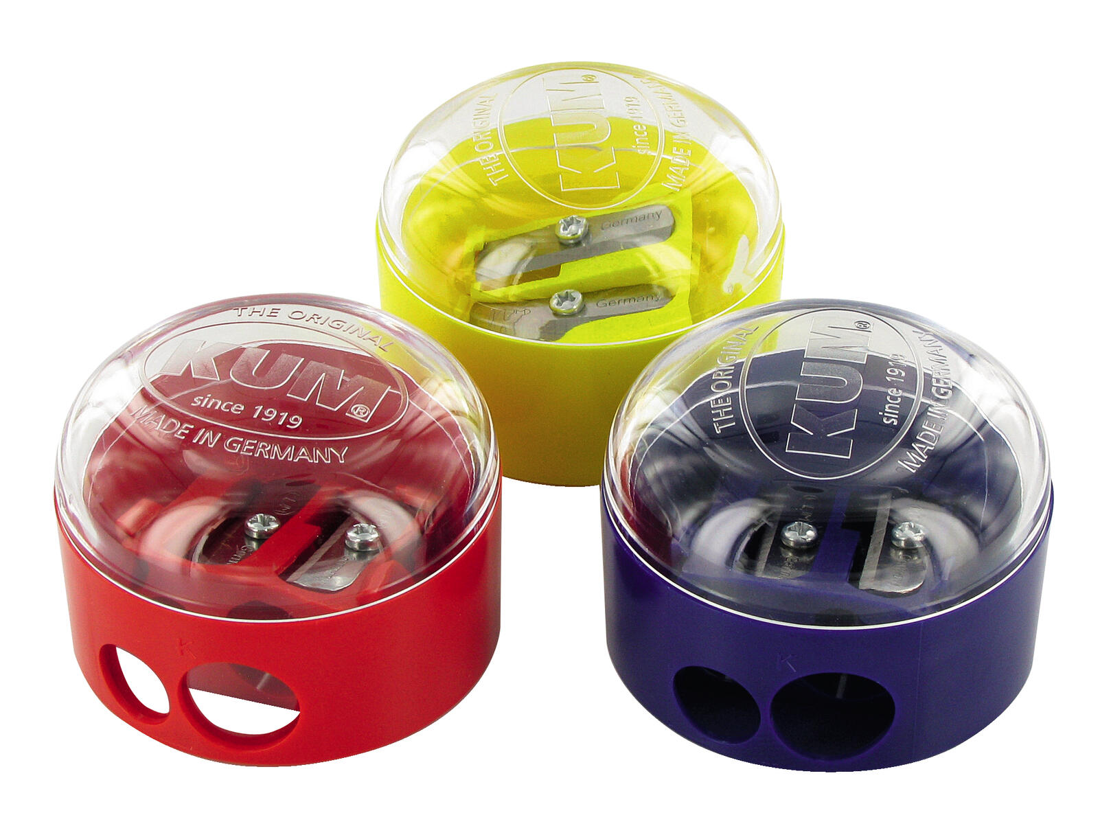KUM 4-i-1 vässare för rund, hexagonal och trekantig blyertspenna. 4 hål för penndiametrar 7, 8, 10 och 11 mm. Rymlig, genomskinlig behållare. Fliplock över hålen. Dra försiktigt i locket för att ta ut vässardelen och tömma behållaren. Av plast. Blandade färger. Mått: H6xB4,5xD3,5 cm. Från 3 år.