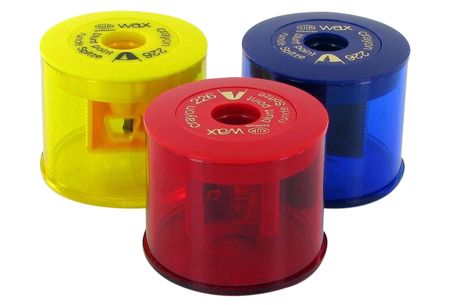 KUM waxcrayon 226 vässare för kritor upp till 12 mm. Ger en perfekt rundad spets. Passar vax-, akvarell- och plastkritor. Ej för olje- och torrpastellkritor. Rund, rymlig genomskinlig behållare. Av plast. Blandade färger. Mått H4, ø 5 cm. Från 3 år.