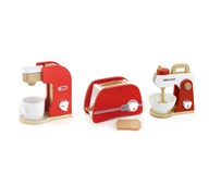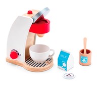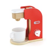 En fin kaffebyggare som gör rolleken ännu roligare. Kaffebryggaren har en rörlig knapp på sidan, ett lock som går att lyfta och en knapp att trycka på för att få kaffe. En kopp, en sked, en mjölkkartong och en sockerskål ingår. Av trä. PVC-fri. Från 3 år.