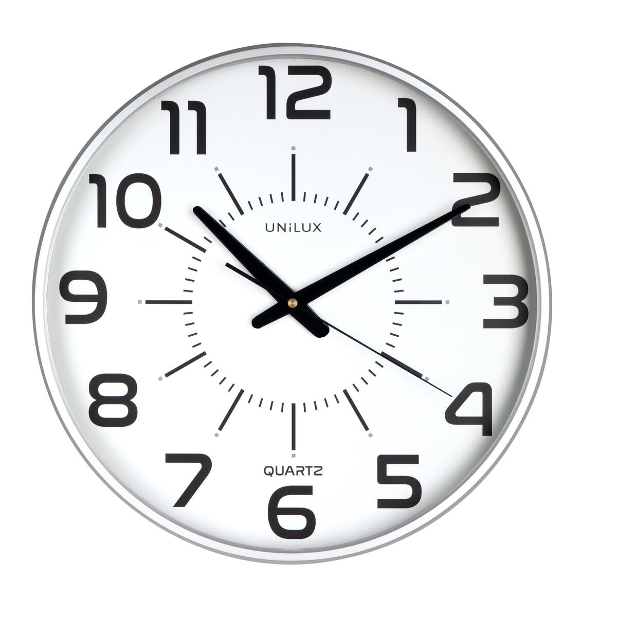 Rund modell med säkerhetsglas, sekundvisare och tydliga svarta siffror. Silvrig ram. Quartzur som drivs med 1 st AA-batteri. Klockan är helt ljudlös. OBS! Batteri medföljer ej.