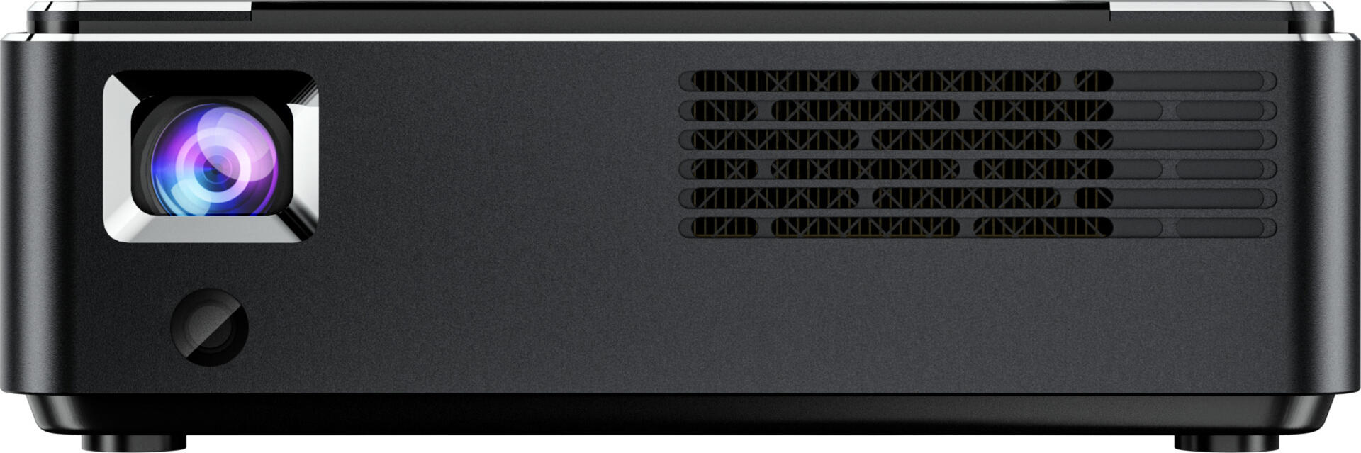 150 ANSI lumen. En extremt kompakt projektor som får plats i handflatan eller i fickan. Projicera bilder och video trådlöst på vilken yta som helst, inomhus eller utomhus; projektorn har full HD och är utformad för optimal rörlighet. Styr via fjärrkontroll eller direkt på projektorn. 30 000 timmars livslängd på LED-lampan och inbyggt batteri med två timmars batteritid. 1 mini HDMI-ingång, hörlursutgång AUX, USB-uttag. Innehåller: projektor, strömkablar, fjärrkontroll, tripodstativ och en trådlös mus. Mått: 55x55x55 mm, vikt 180 gram.