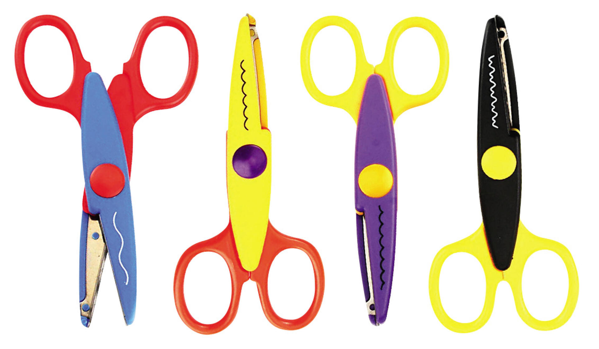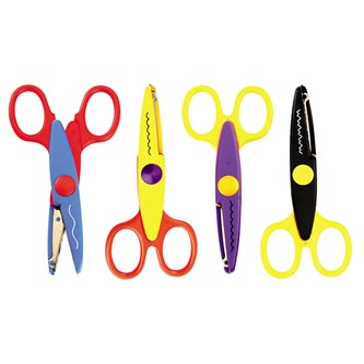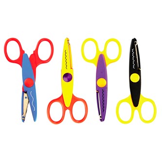 4 st/fp. Mindre mönstersaxar med 4 olika klippmönster för collage, kort etc. Mönstret är tryckt på varje sax. Blandade färger. Halvrund spets. Längd 135 mm. Bladlängd 45 mm. Plastdelar av ABS.