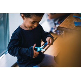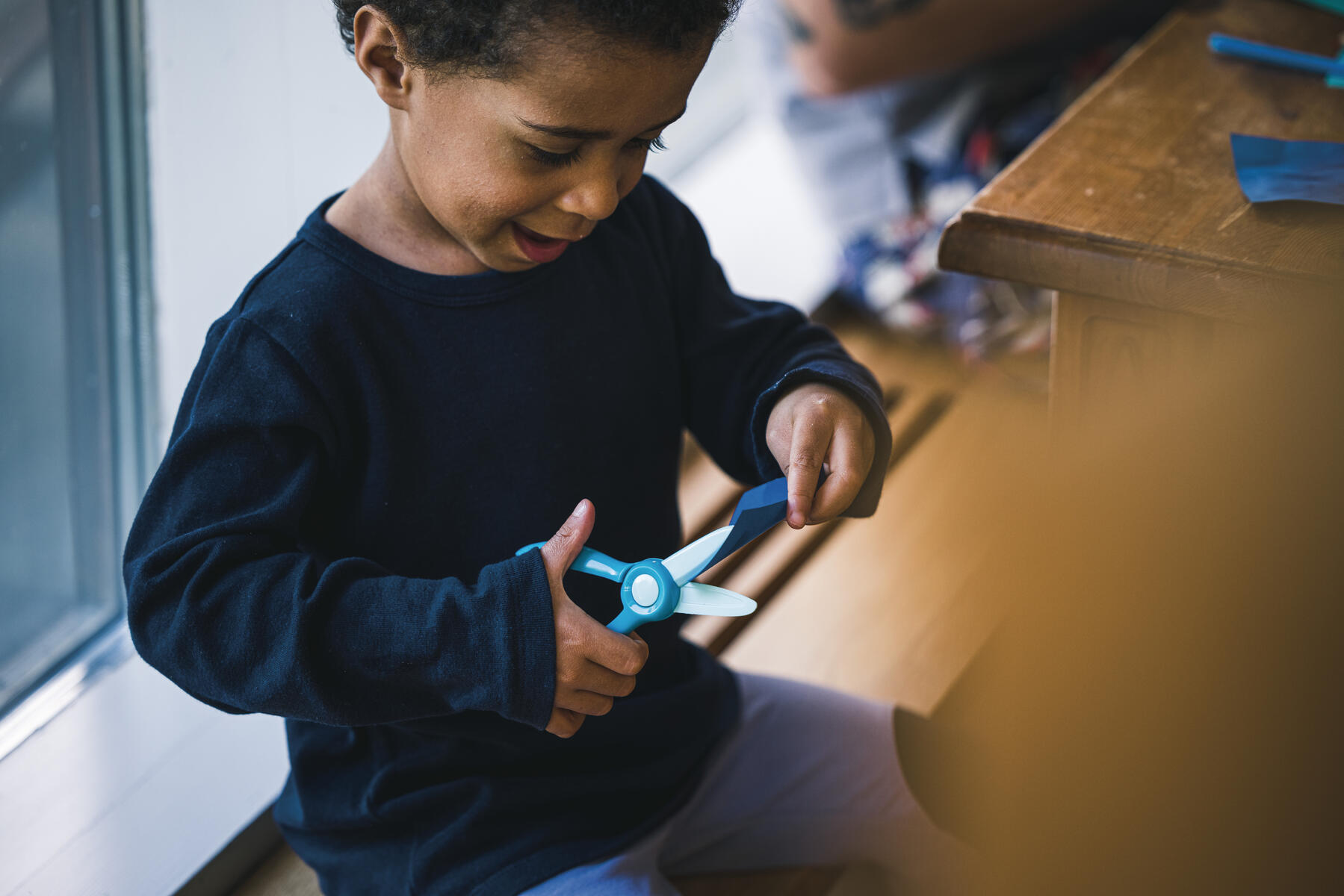 Sax som passar de minsta barnens händer. Säkra, plastbelagda blad och raka handtag utan öglor gör den enkel att greppa. En fjäder öppnar bladen efter varje klipp. Bladen öppnas också med minimal vinkel för att det ska gå lätt att använda saxen utan att tappa greppet. Passar både höger- och vänsterhänta. Längd 12 cm. För barn från 2 år.