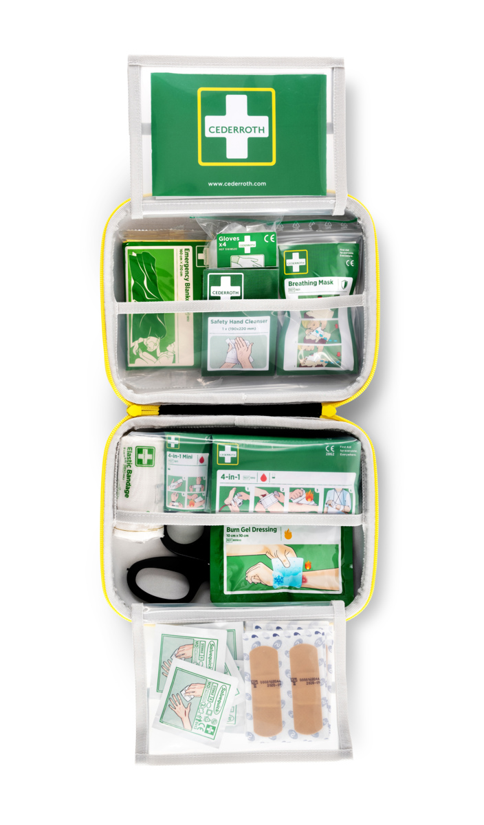 Cederroths första hjälpen-tavla täcker alla grundläggande behov. Alla produkterna finns för påfyllnad. Innehåller: 2 st blodstoppare, 3 st miniblodstoppare, 2 st Burn gel dressing, 1 st ögon- och sårsköljningsspray 150 ml, 1 rulle plåster soft foam, 1 plåsterautomat med 85 plåster, 20 sårtvättare, 1 Cederroth skyddspaket och 1 första hjälpen-instruktion. Tillverkad i tålig ABS med lock av polykarbonat. Mått: 29x56x12 cm.