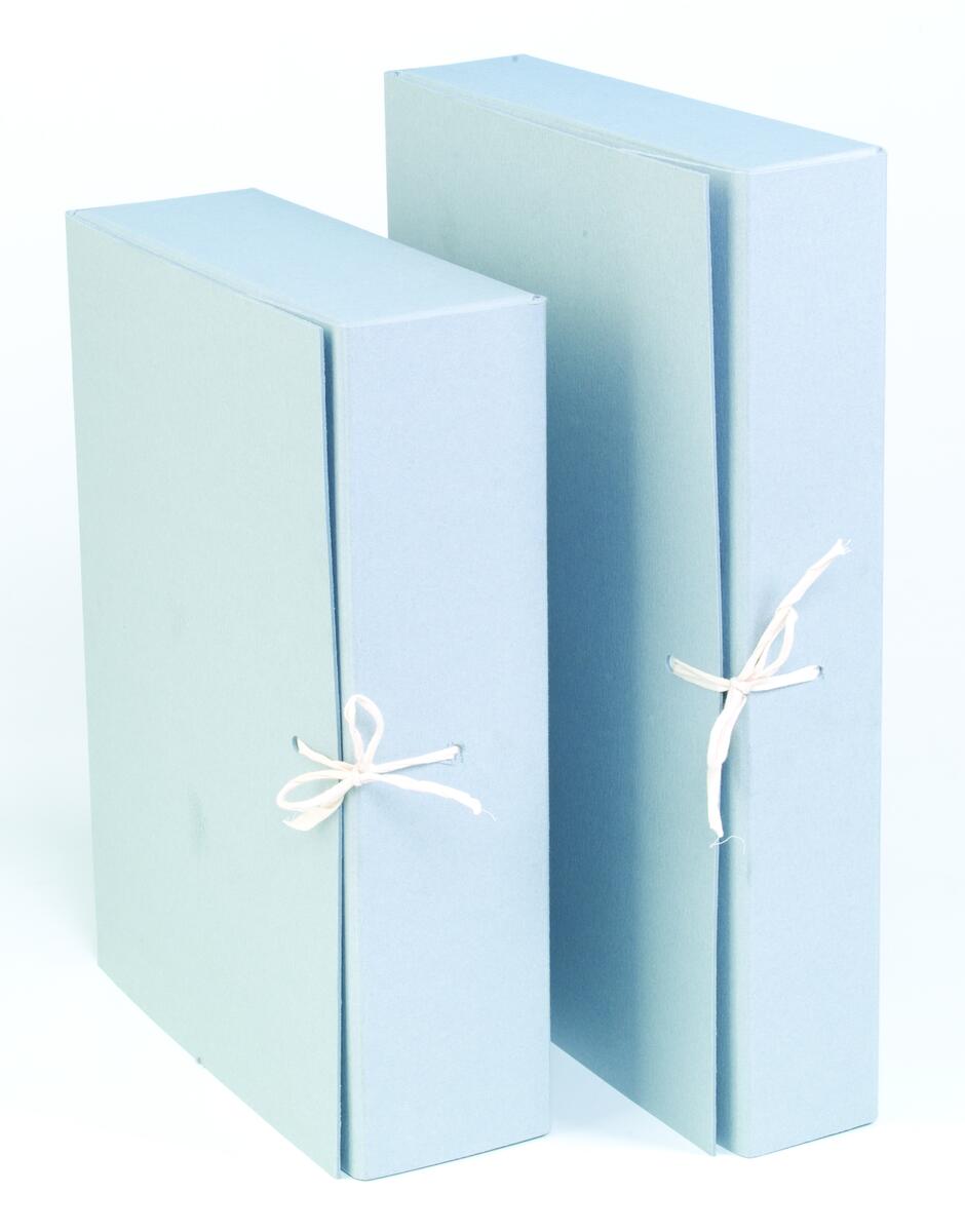 1 st/fp. Boxen är tillverkad av 1,4 mm tjock arkivbeständig kartong. Materialet är fritt från lignin och uppfyller kraven enligt standarden ISO 16245. I ljusblå nyans.
