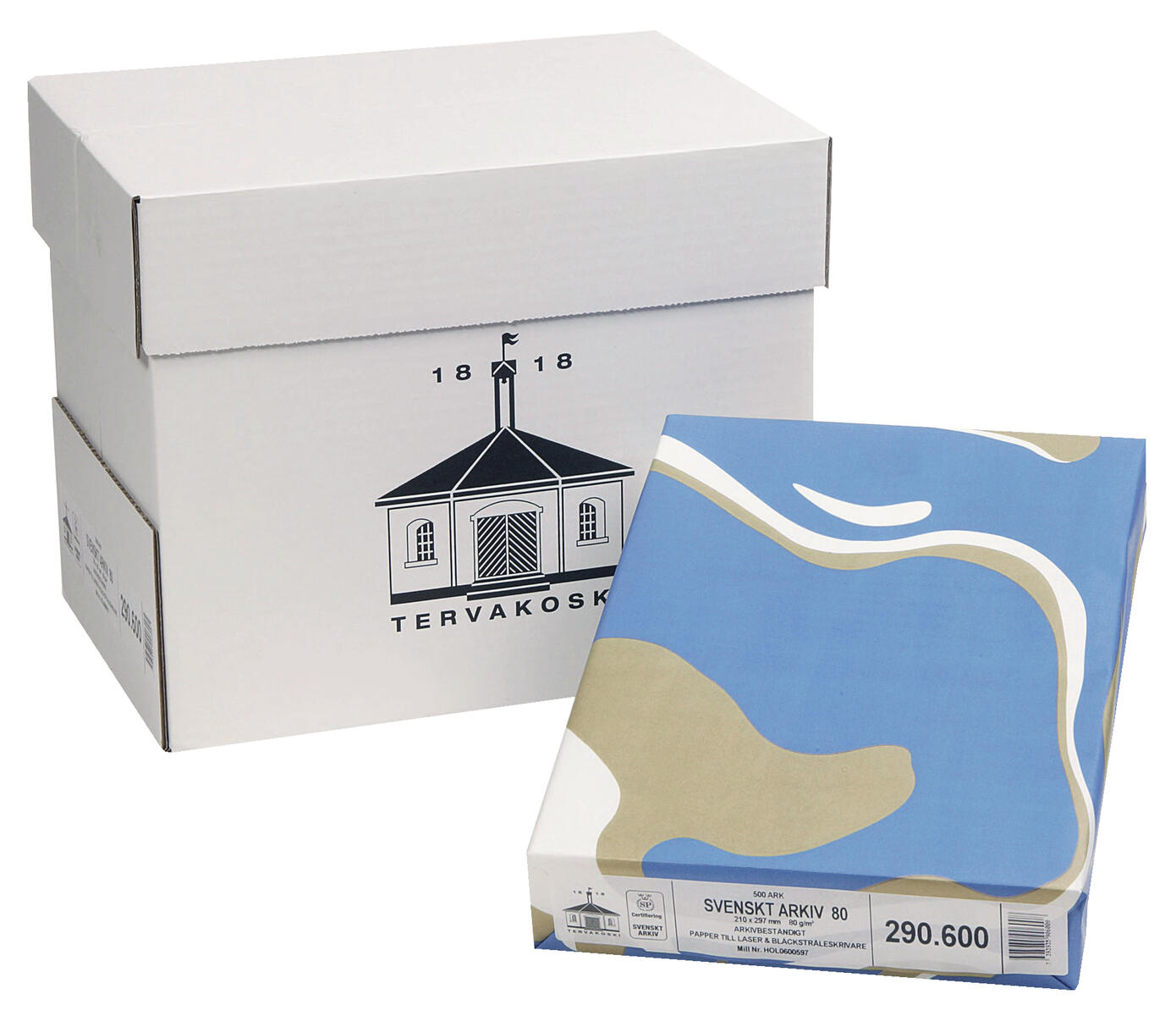 500 ark/fp. Ett ohålat, klorfritt (TCF) papper av 100 % lump (bomull/linne) med oplacerat vattenmärke. I vattenmärket ingår jämte texten "Svenskt Arkiv" ytvikten, brukets namn och tillverkningsår. För kopiering, laserskrivare och kontorsoffset. Avsett för handlingar som skall arkiveras under längre tid, enligt Svensk Författningssamling ISO11108. ECF.