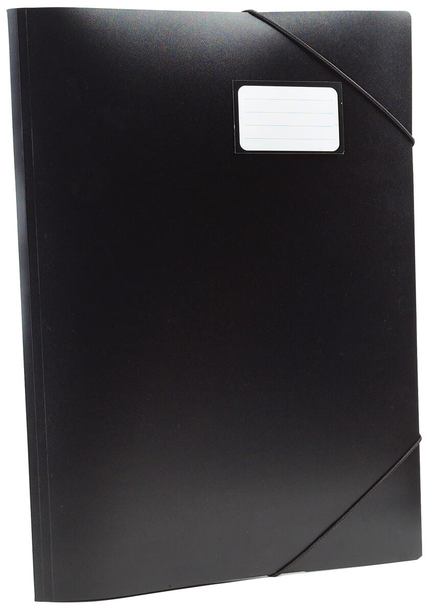 3 klaffar för säker förvaring av material upp till A3-format. Tillverkad av svart polypropen, med visitkortsficka.
