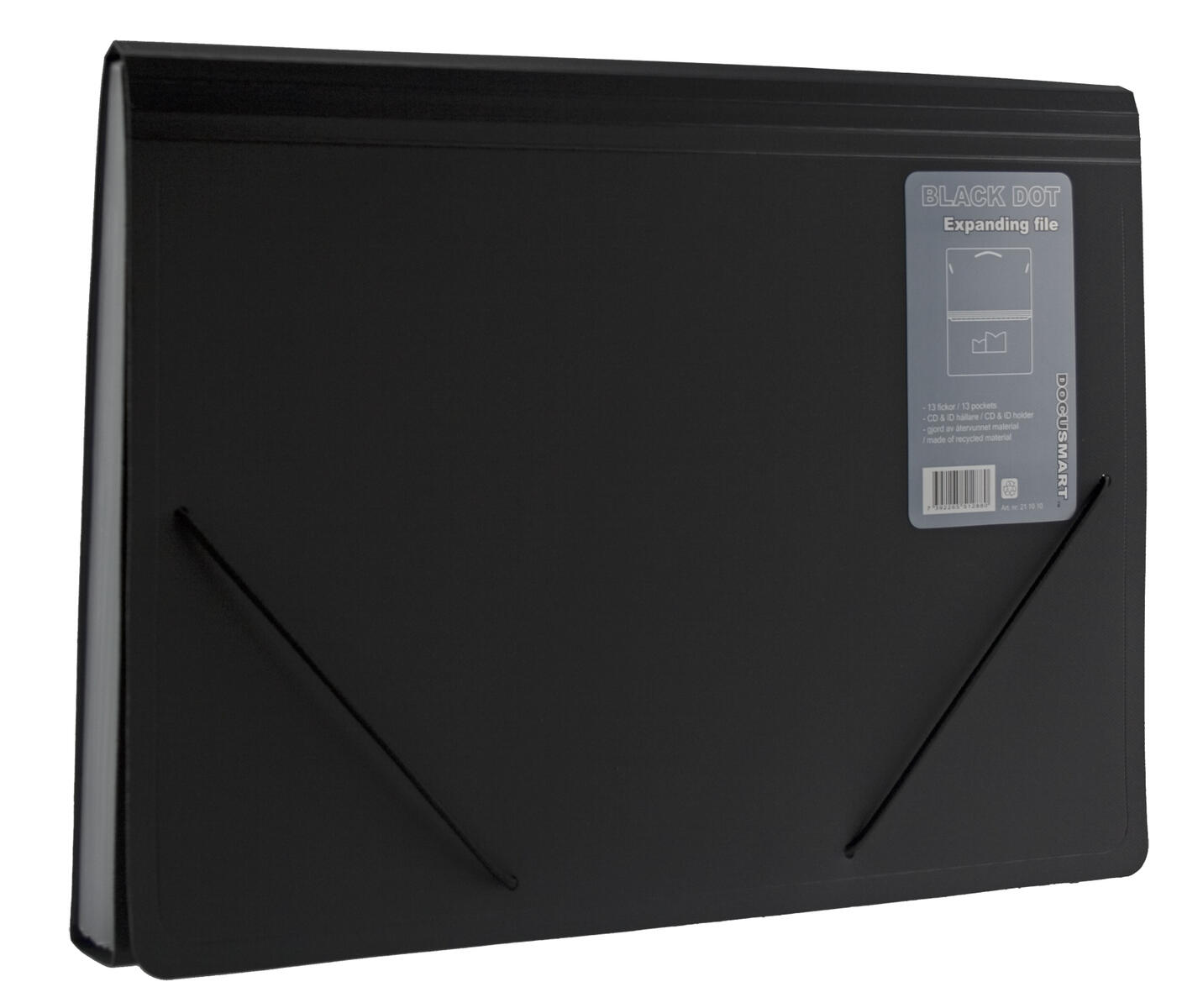 Hemarkiv BLACK DOT, A4 med 13 fickor och 12 indexflikar (indexpapper medföljer). Plats för CD-skivor och visitkort på insidan. Tillverkad av återvunnen PP-plast.