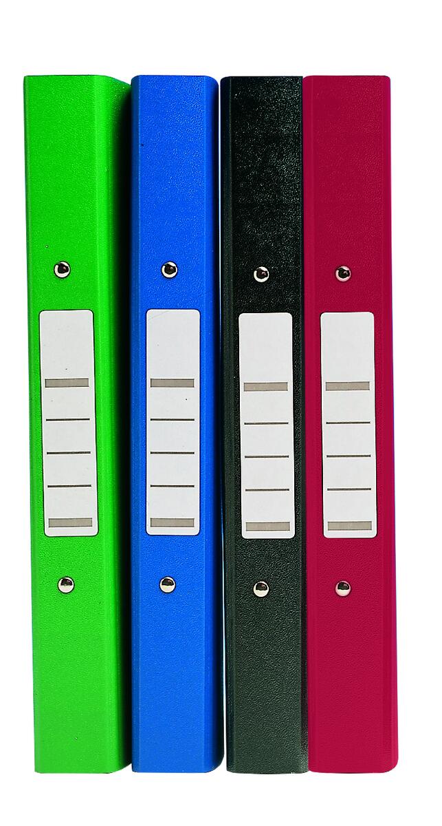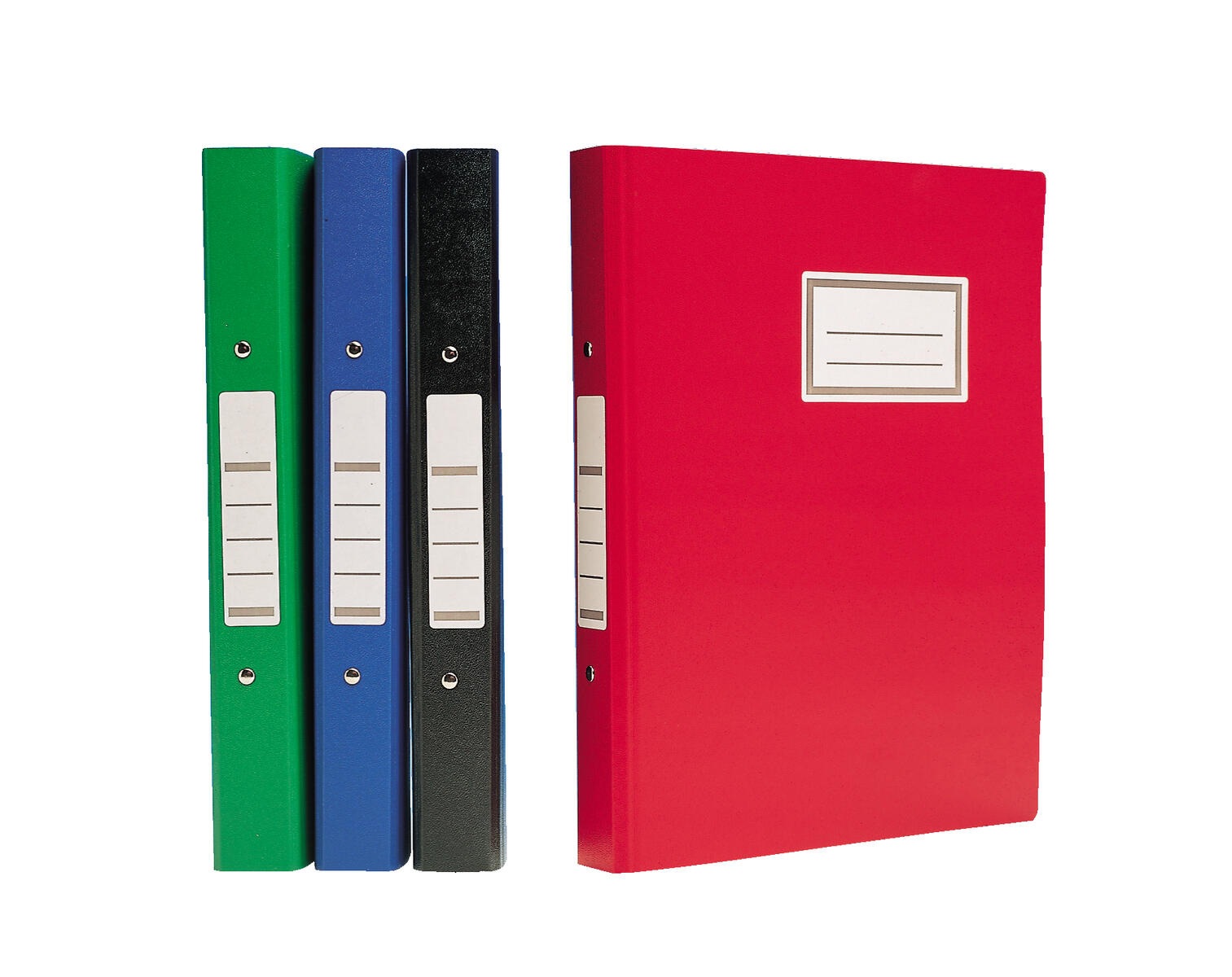 75 st/fp. Ingår 25 ringpärmar i 3 olika färger (röd, blå och svart). Tillverkade i konstläderpapp av returfiber. Med 29 mm nitad 4-ringad mekanism. Etikett på framsida och rygg.