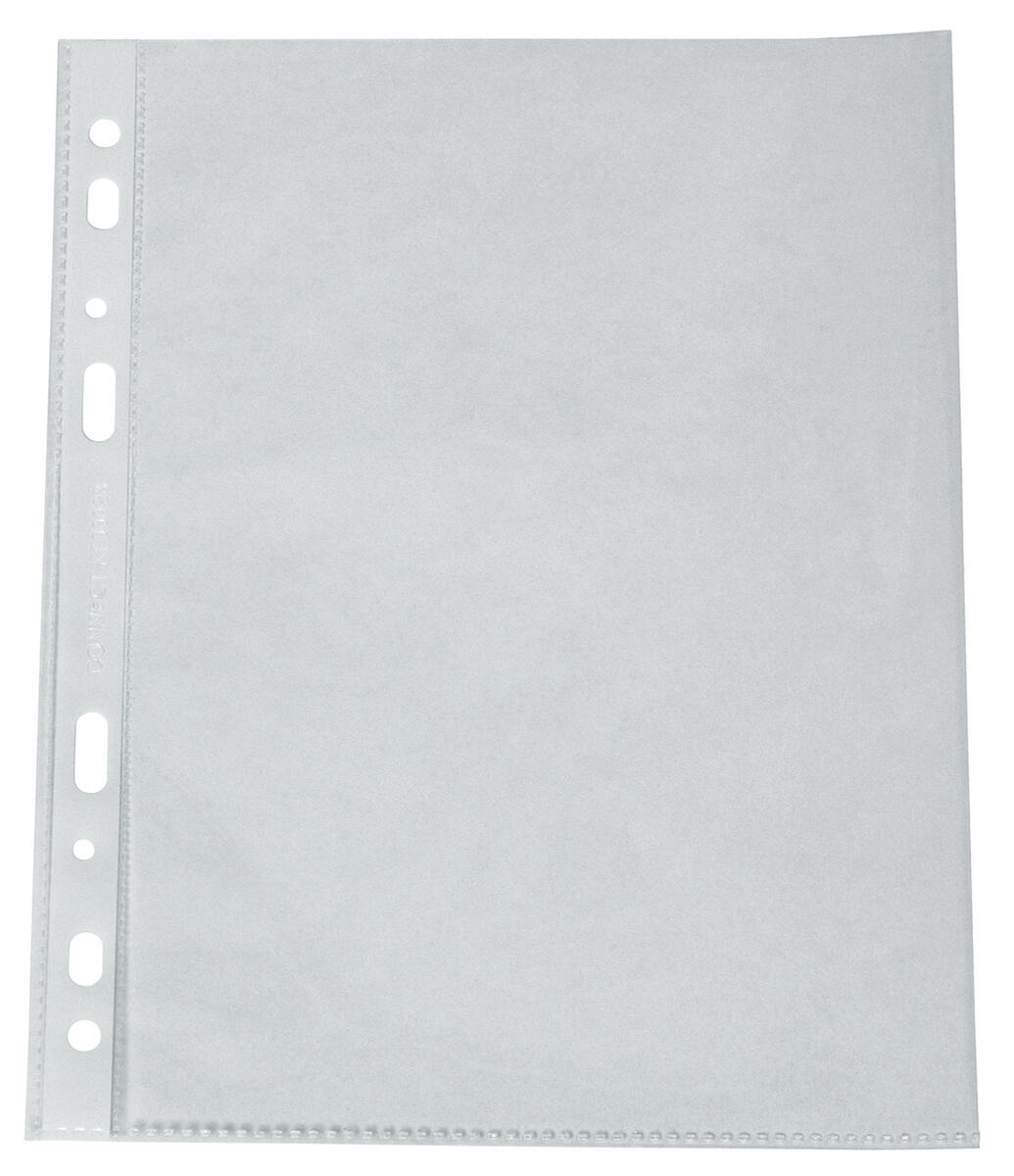 100 st/fp. Reflexfri plastficka av präglad polypropen. Öppen i överkant. Lätt att bläddra och öppna. Kopiesäker. Vit förstärkt rygg med internationell hålning