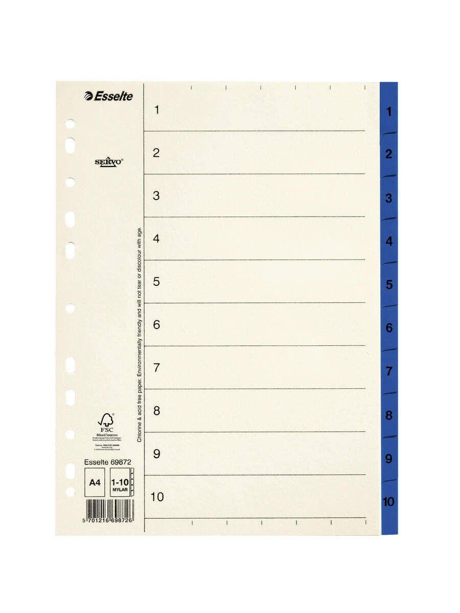 A4. Kartongregister innehåller plastförstärkta och färgade flikar. Vit kartong 170 g. Tryckt förstasida och flikar. De numrerade flikarna är ingående råvara FSC märkt och bokstavsflikarna är PEFC-märkt.