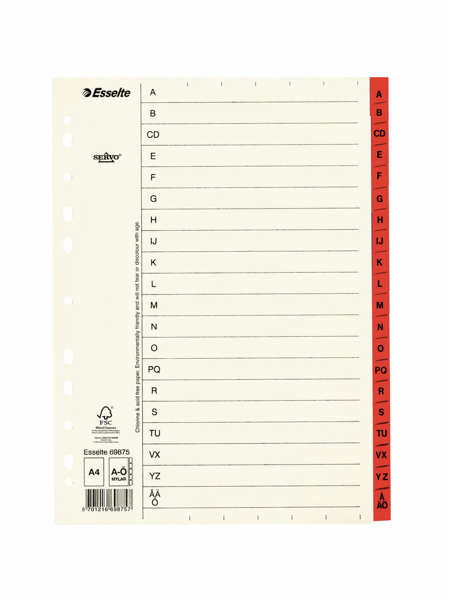 A4. Kartongregister innehåller plastförstärkta och färgade flikar. Vit kartong 170 g. Tryckt förstasida och flikar. De numrerade flikarna är ingående råvara FSC märkt och bokstavsflikarna är PEFC-märkt.