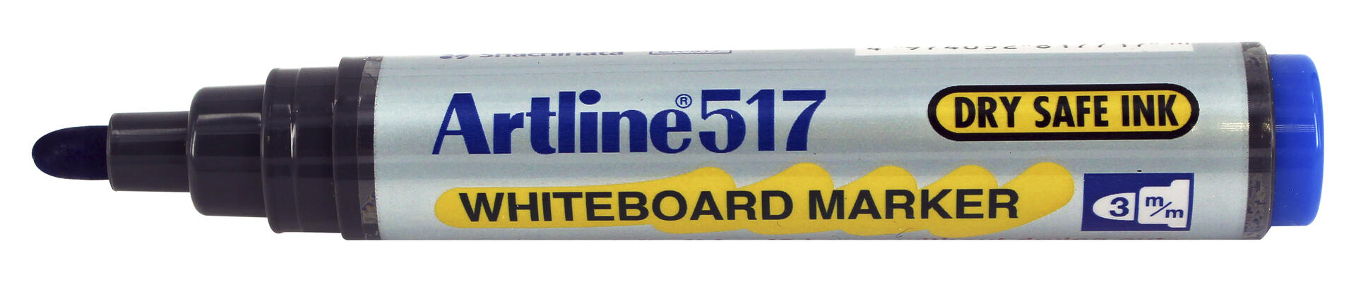Whiteboardpenna med snedskuren spets. Skrivbredd 2-5 mm. Alkoholbaserat pigmentbläck utan xylen. Pennan kan ligga utan huv i 48 timmar utan att torka. Plastkropp.