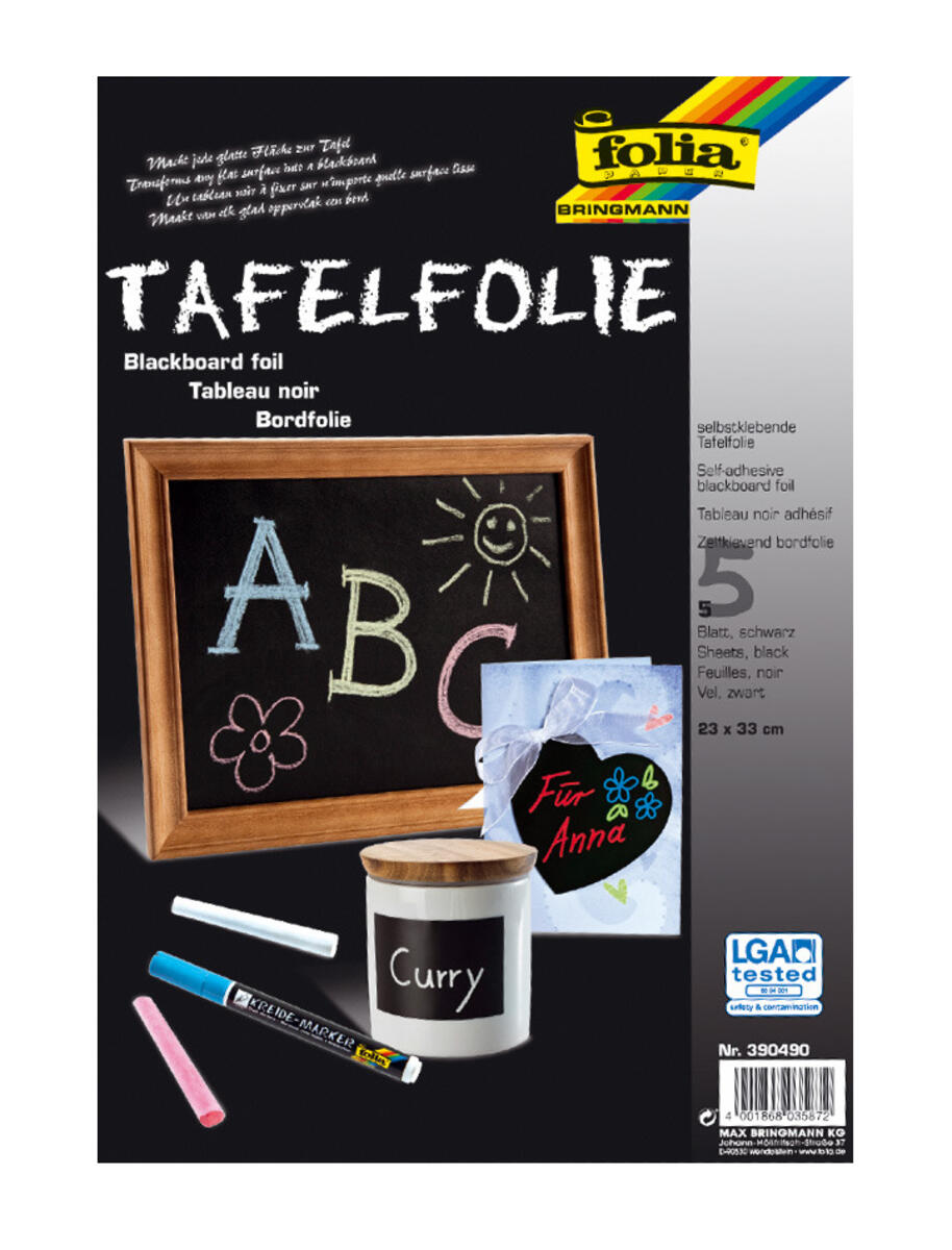 5 ark/fp. Svarta, självhäftande ark för tavelkritor och kritpennor som finns i sortimentet. Färg torkas enkelt bort med fuktig trasa eller taveltork för whiteboard. Kan klippas till önskad storlek eller form, och fästas på de flesta släta ytor. Tapet och målade väggytor kan skadas om folien dras loss. Mått: 23x33 cm.