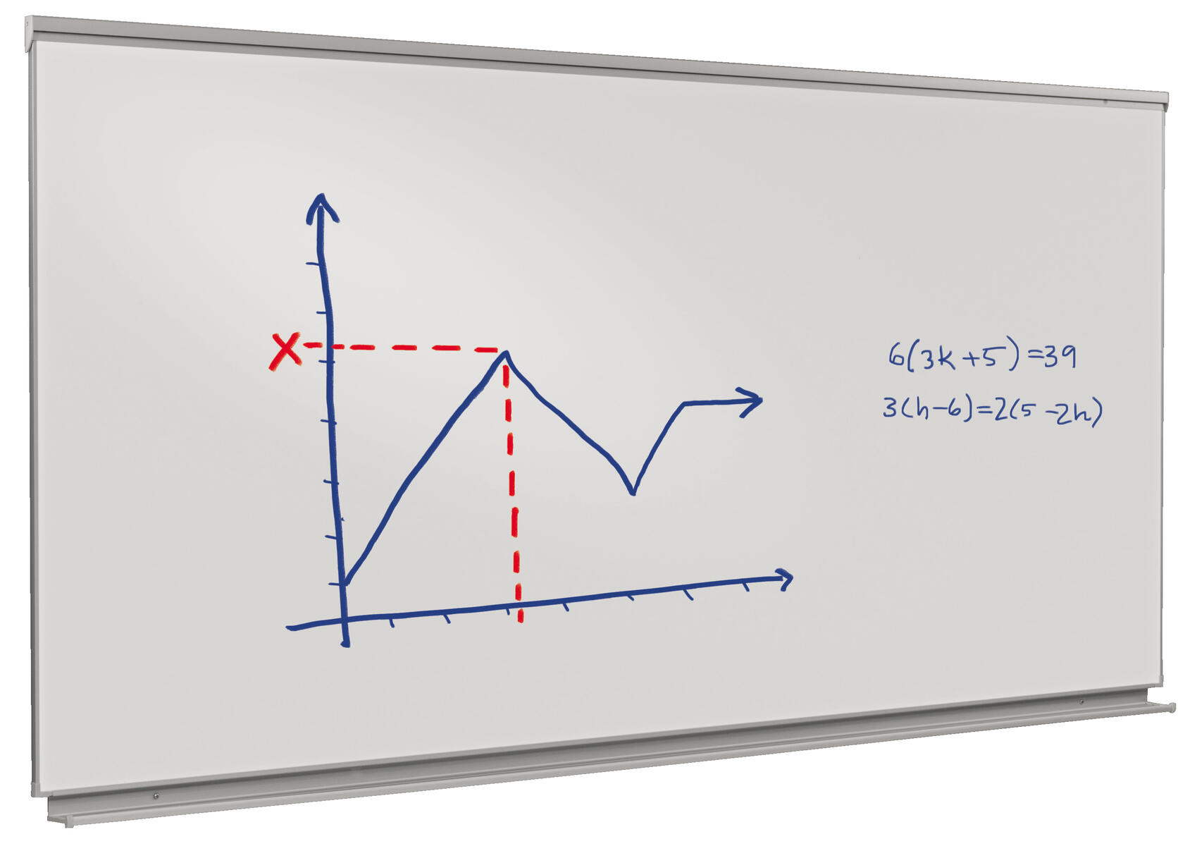 Skrivtavla med aluminiumram som går att få med olika ytor. Svart, blå och grön är för kritor. Vit är med glasemaljerad plåtyta för whiteboardanvändning. Grå plasthörn. Pennhylla och beslag för väggmontering medföljer. Magnetisk.