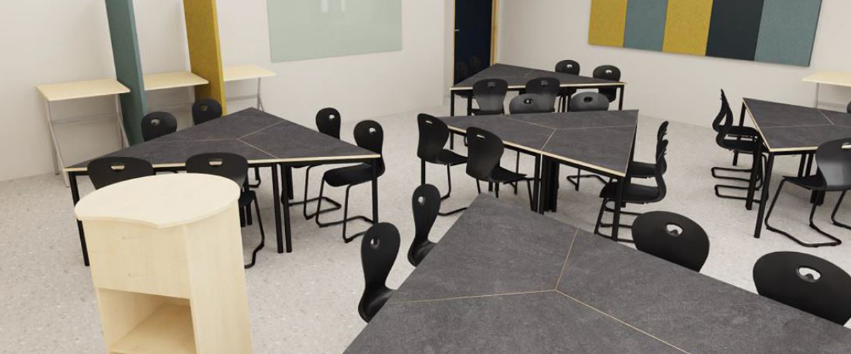 Här är en av alla 3D-ritningar som vår inredningsarkitekt Jessica skapade när vi presenterade inredningsförslaget för skolan. Bilden föreställer det som kom att bli ett av klassrummen för årskurs 7-9: