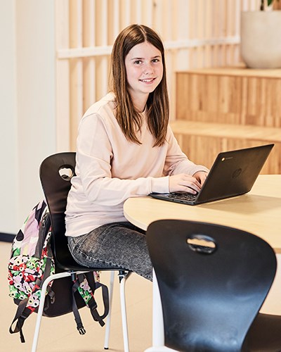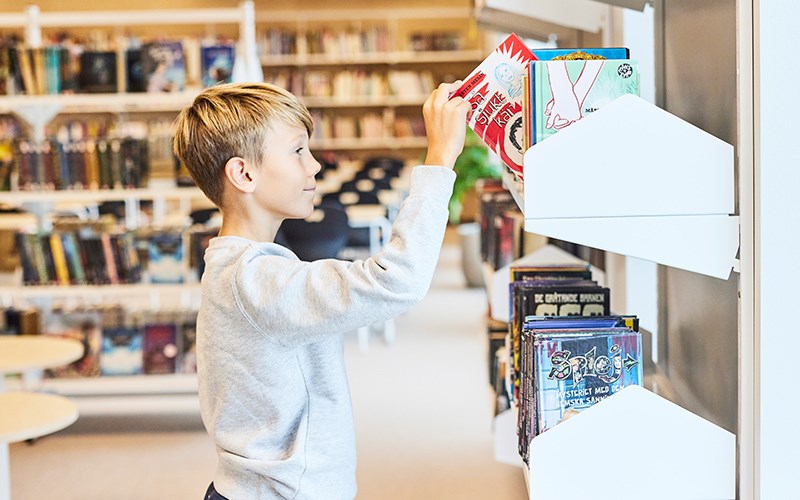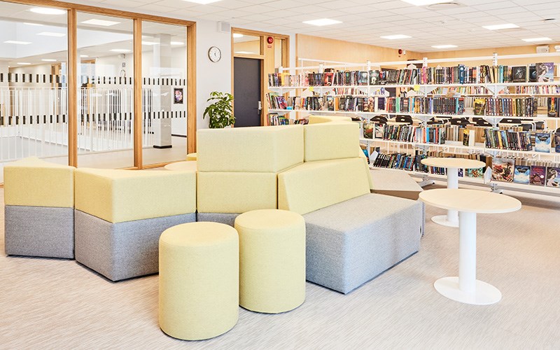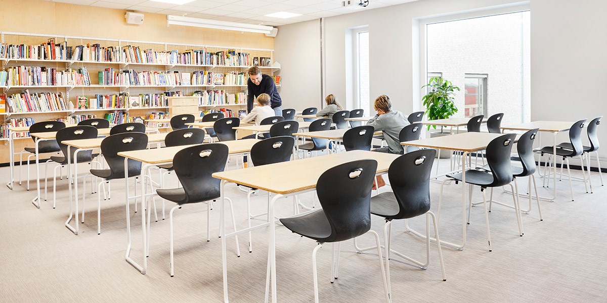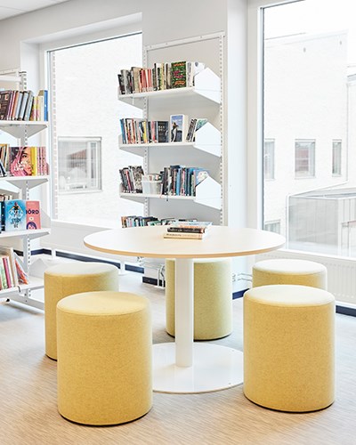 Bibliotekets stora och ljusa rumsvolymer förstärks av de öppna bokhyllorna från serien Wille Skensystem. I rummets mitt finns den rundade modulsoffan Penta (kontakta kundtjänst för info) som har blivit mycket populär för samlingar eller stillsamt bokslukande. Framför soffan syns pelarbord Pilastro. Med hjälp av puffarna Volt kan en hel klass få plats. Det stora biblioteket har även plats för en öppen yta som är möblerad som en läsesal med möjlighet att snabbt möblera om för olika behov. Här kan eleverna slå sig ner för att studera och fokusera. Det finns även utrymme för nära samtal och grupparbeten runt det lite större pelarbordet och Volt-puffarna.