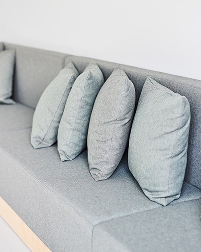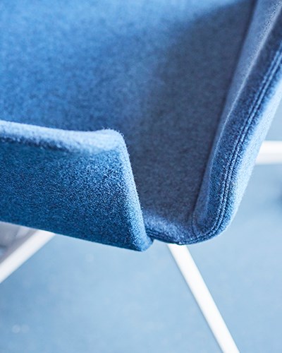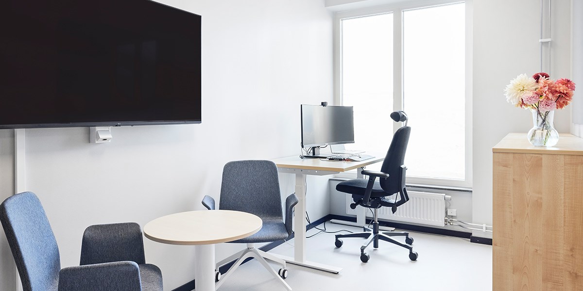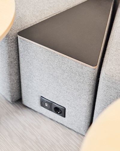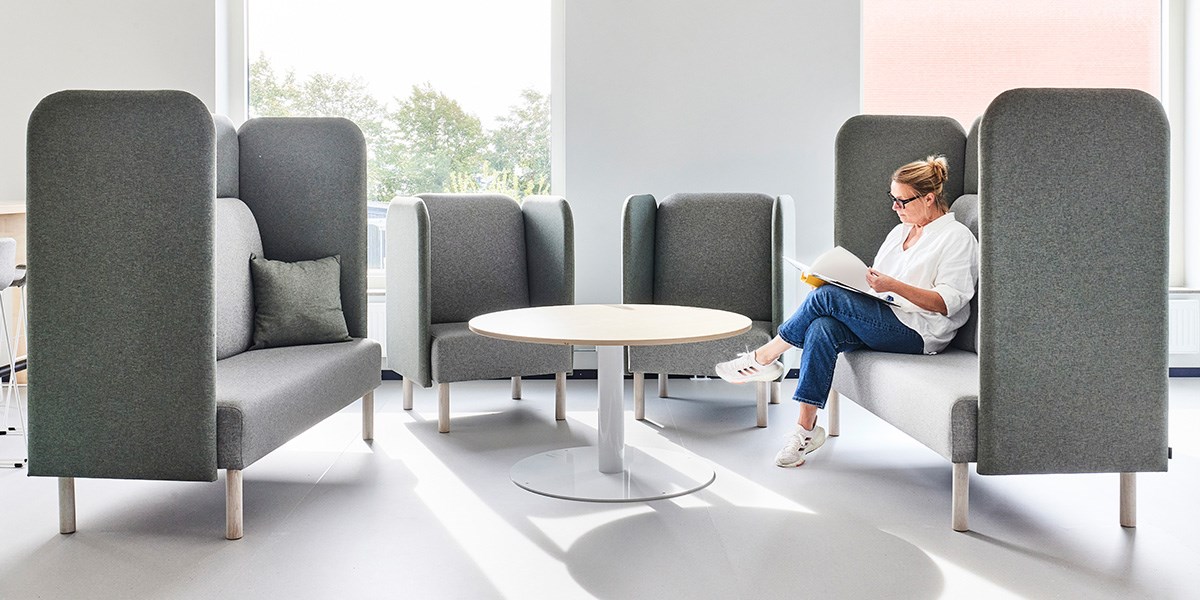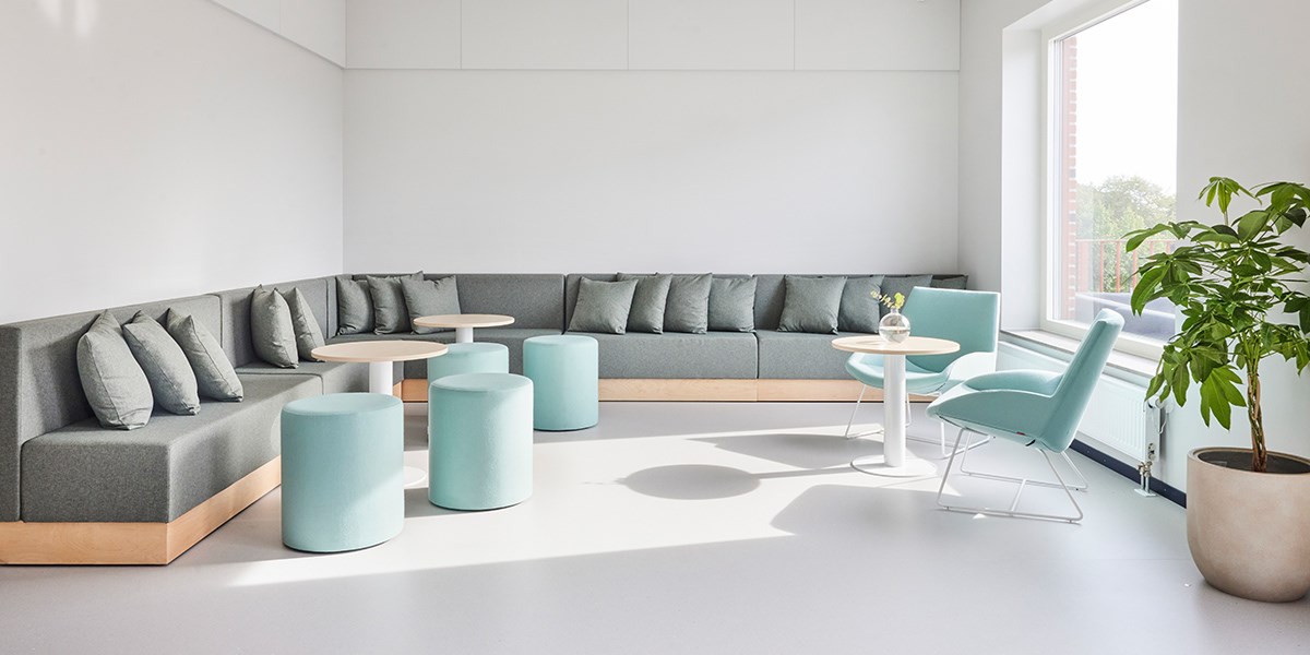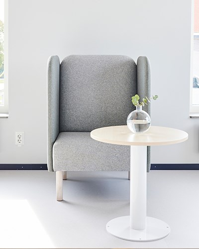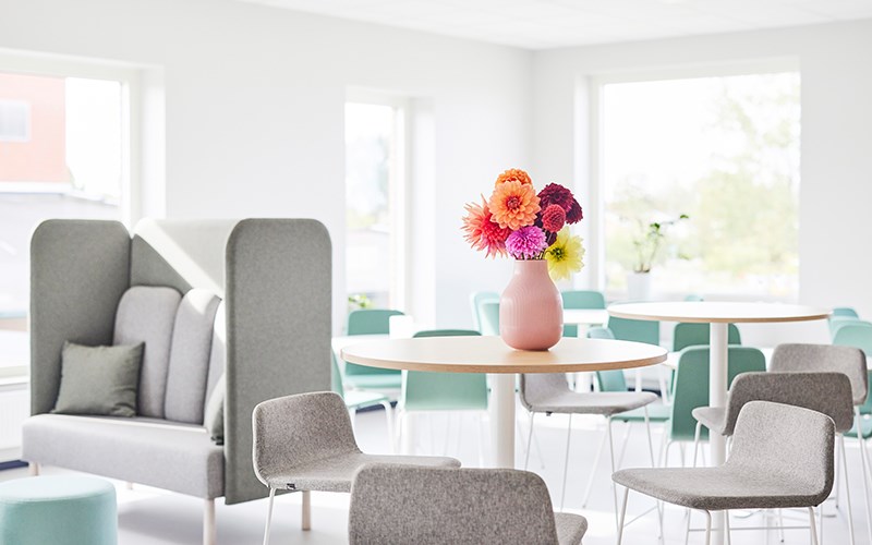 Personalrummet och personalmatsalen, även kallat pausrummet, har fått en harmonisk och smakfull inramning. Här kan personalen återhämta sig mellan varven, prata med sina kollegor eller bara slappna av i någon av alla sköna möbler. Inredningen går i sobert grå och ljusblå nyanser och har fått flera olika funktioner. Allt från en mysig lounge som får rumslighet med den högryggade soffan August (kontakta kundtjänst för info), till matplatser i olika höjder samt bekväma fåtöljer.