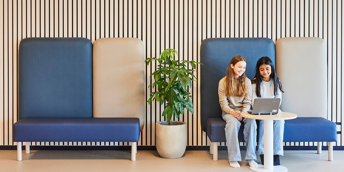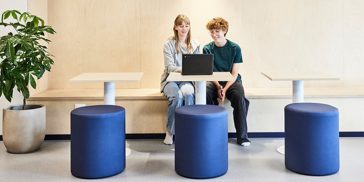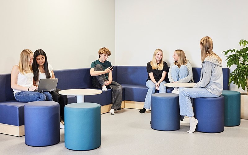 De gemensamma ytorna på skolan är flera vilket bjuder in till både enskilt arbete, grupparbete och rasthäng. Ett av hörnen har blivit utrustat med den långa platsbyggda soffan Snake (kontakta kundtjänst för info) i kombination med pelarbordet Pilastro och sittpuffen Volt. Här kan eleverna samlas för att arbeta tillsammans eller slappna av efter lektionen.