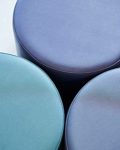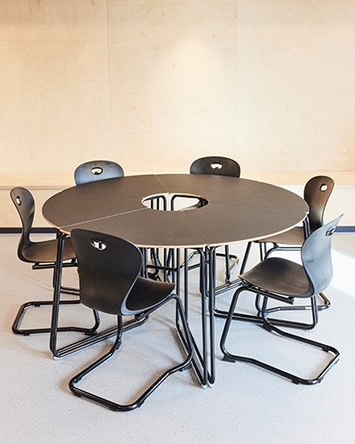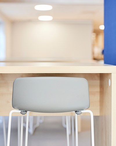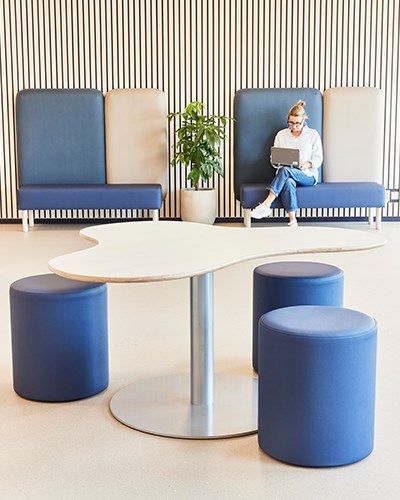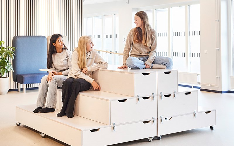 I en annan del av skolan sätter möbelserien August (kontakta kundtjänst för info) tonen tillsammans med pelarbord Pilastro. Med material i konstläder och hög rygg skapar den karaktär, ljuddämpning och rumslighet. I mitten tornar scentrappan Stage upp sig. En delbar och flyttbar trappa som ger bra överblick och bjuder in till improviserade shower på rasten. Här syns också bord Klöver som med sin utformning lämpar sig perfekt för grupparbeten.