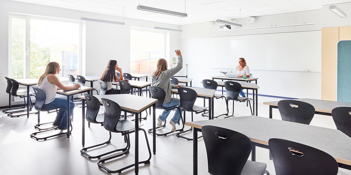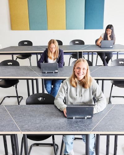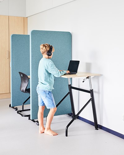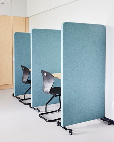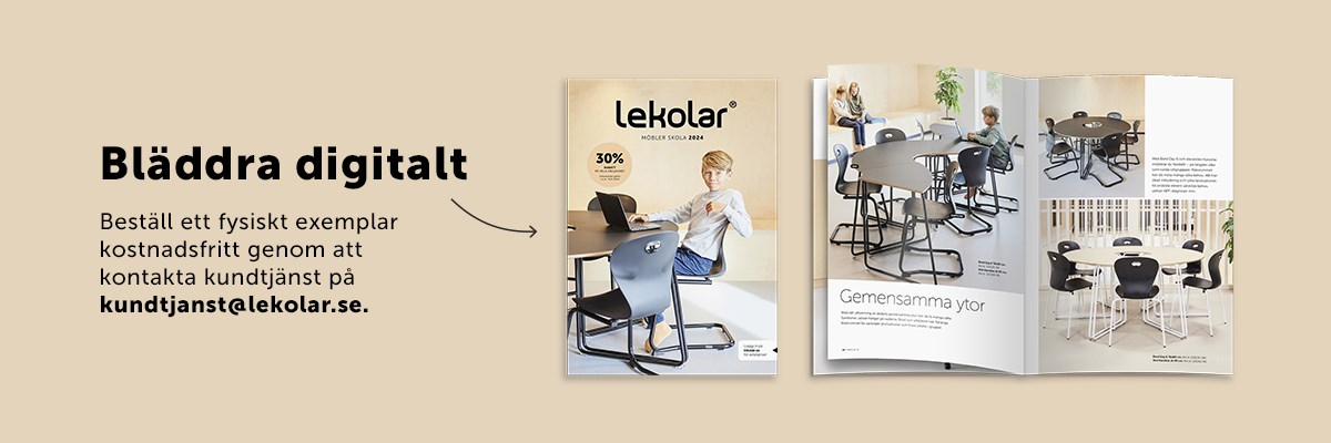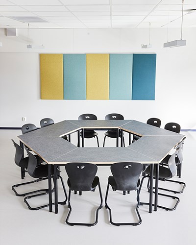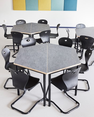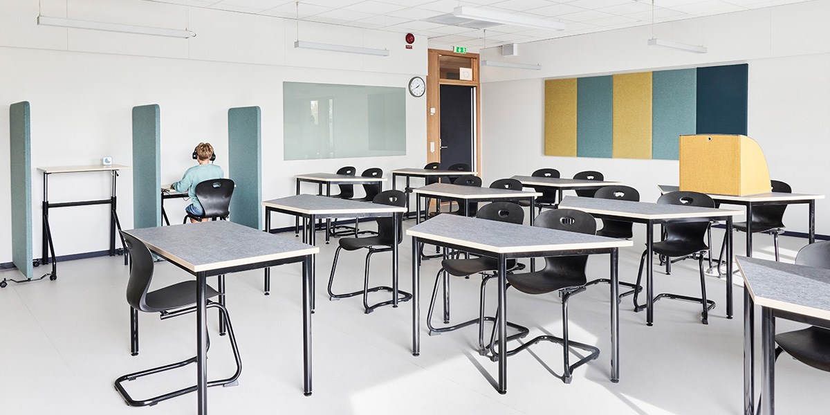Ett riktigt bra klassrum ska kunna rymma flera olika lärmiljöer. Med rätt möbler kan det enkelt anpassas för olika lärsituationer och särskilda behov. Lekolars trapetsbord 12:38 kan kombineras på en mängd olika sätt. Bordets smarta geometri öppnar upp för allt från enskilt arbete till kombinationer för små och stora grupper. Med arbetsyta i naturnära linoleum ljuddämpas rummet tillsammans med våra olika ljudabsorbenter. På bilderna syns väggabsorbenten Absoform men också de stapelbara elevstolarna Karoline som snabbt frigör ytor och är enkla att hänga upp inför städningen. Den ljuddämpande golvskärmen Enkel skapar inte bara skyddade studieplatser för särskilda behov. De skapar också rum-i-rummet. Bord Altudo är höj- och sänkbart för elever som behöver variera arbetsställningen.