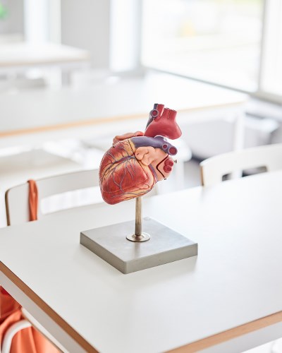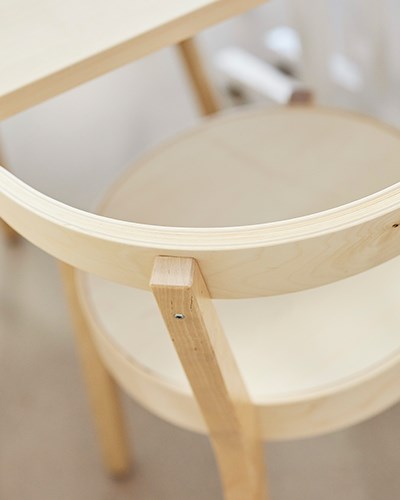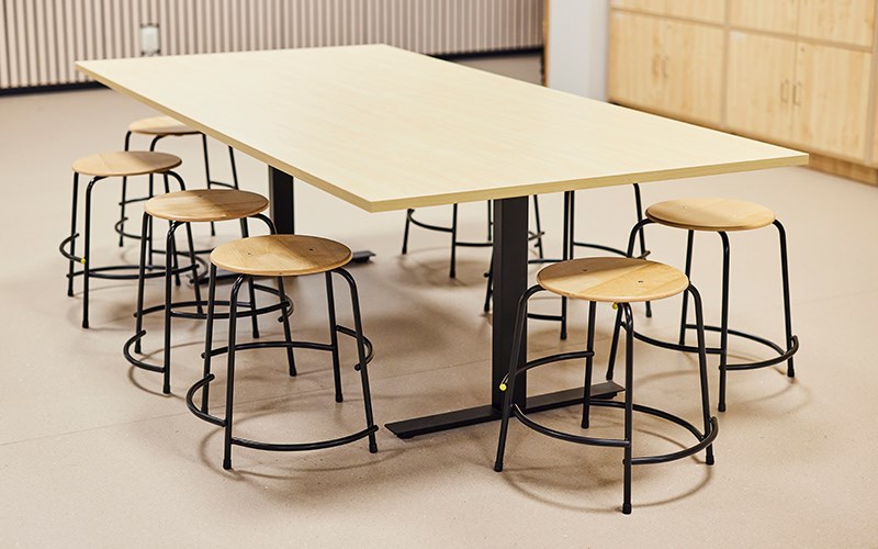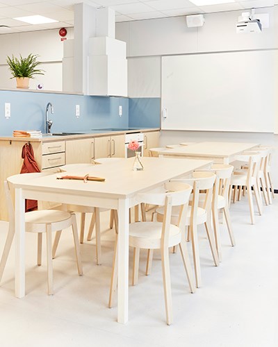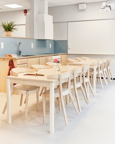 Den ljusa och inbjudande hemkunskapssalen har inretts med ändamålsenliga och hygieniska möbler. Salens ton är blond och trivsam med drag av hemmiljö. Bord Maria har slitstark skiva i ljuddämpande akustiklaminat och underrede i björk. De tidlösa stolarna Circum är i samma material och är enkla att hänga upp efter lektionerna. Dagens recept skrivs enkelt upp på whiteboardtavlan.
