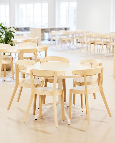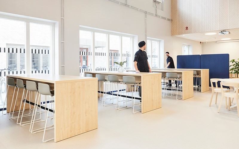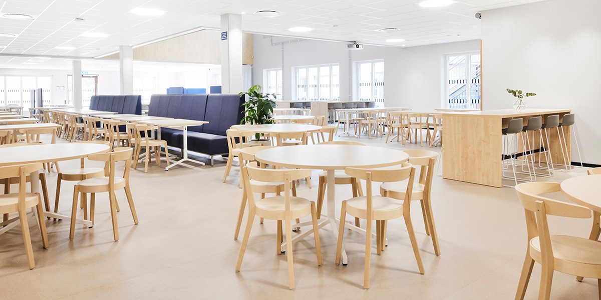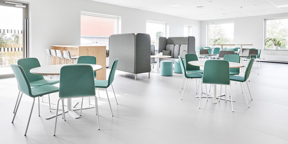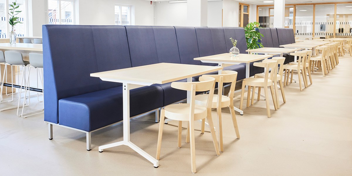 Den stora matsalens öppna planlösning har fått en trivsam och ljuddämpad cafékänsla. Med olika möbler och avtorkningsbara akustikskärmar (kontakta kundtjänst för info) skapas flera avskilda ytor i rummet. Soffan Liner med hög rygg är inspirerad av en klassisk amerikansk diner där städningen underlättas med hjälp av soffans smarta smulgap. Soffan har sällskap av bord Pilare i akustiklaminat och de stilrena stolarna Circum. Inredningen varieras även med de höga barborden McBar och barstolarna Vesper (kontakta kundtjänst för info). De övriga delarna av matsalen är inredda med rektangulära och runda bord från serien Pilare och kombineras med Circum som enkelt kan hängas upp på bordet vid städning. Den varierande inredningen möjliggör allt från enskilda måltider till måltider för hela klassen.