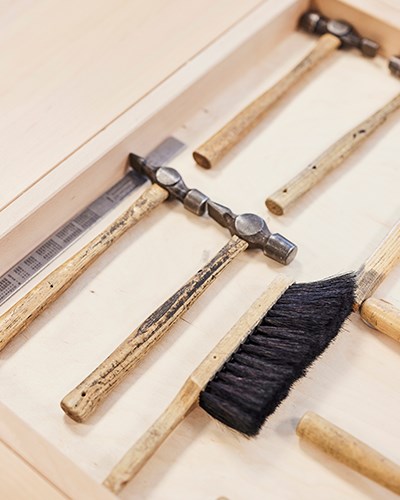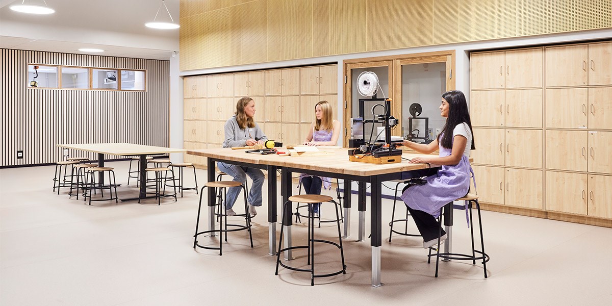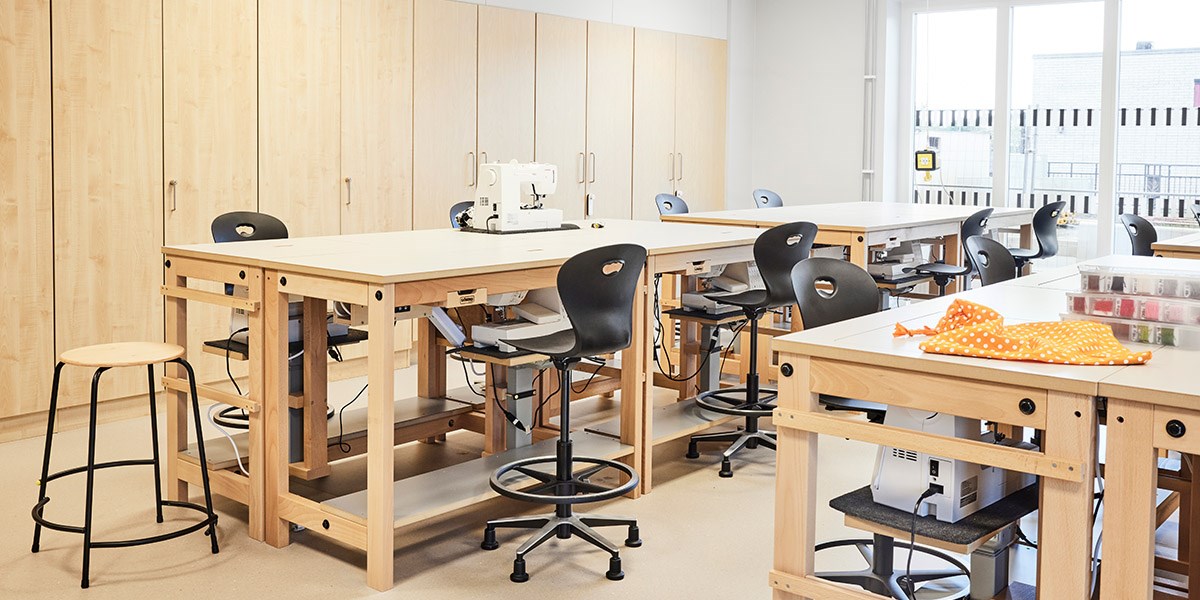 En av gemensamhetsytorna på skolan kan fungera både som träslöjdsyta och ett Makerspace. Arbetsbänk Kraft med hydraulisk höjdjustering och skiva i massiv bok ger en ruff, industriell känsla. Den smäckra och stabila pallen Multi har fotstöd i fyra olika höjder, för att passa alla elever, oavsett längd. Här syns också konferensbord Talk. Även textilverkstaden har fått en robust och naturnära inredning. I denna sal kan arbetsställningen lätt behöva förändras vilket möjliggörs med smarta arbetsbord (kontakta kundtjänst för info) och höj- och sänkbara stol Karoline med fotring.